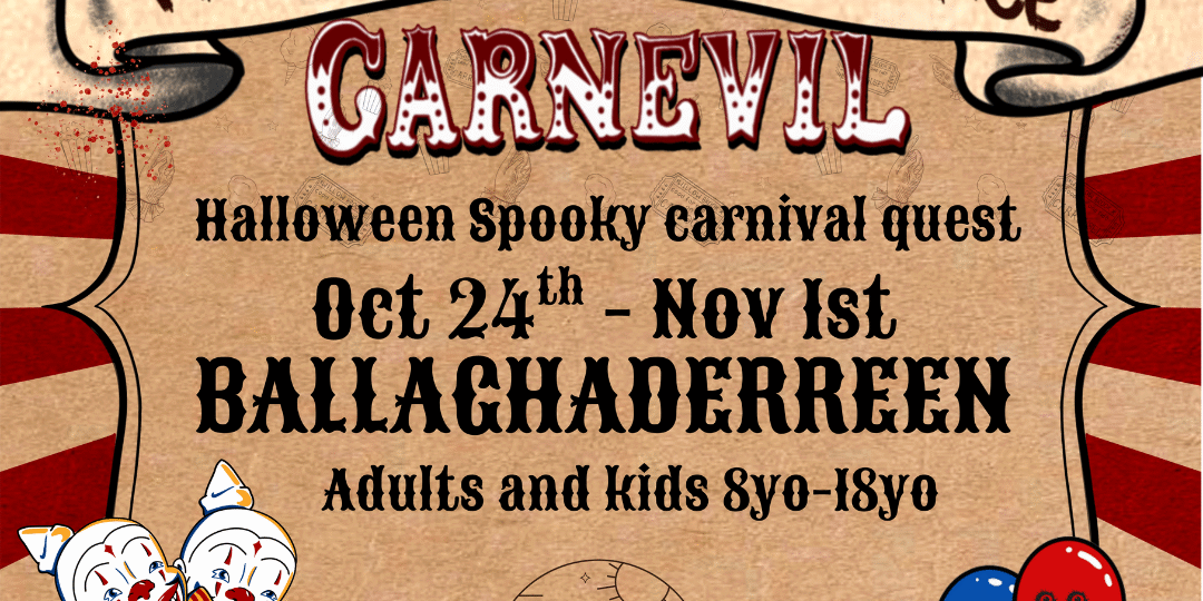 Please note that children in the 8-12 year old age range are open to attend this ‘Spooky Carnival quest’ event OR our afternoon ‘Kiddies halloween walk’ event OR both events. This decision is very much up to the parents. Some children in that age range may find the evening event too scary, and some, particularly towards the older end of that range may prefer the evening scare event and not enjoy the crafting and games involved in the ‘Kiddies halloween walk’ event so much, as it is suitable for kids all the way down to 4 years old. Please consider this before booking tickets for kids in this age range.